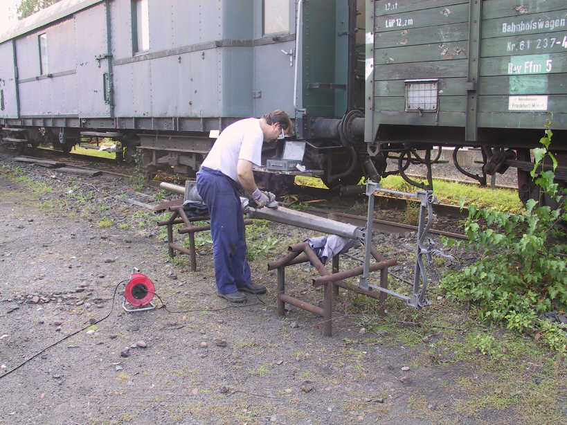 Heute wurden bei der Kö 5712 die beiden Keilriemen des Luftpressers ausgetauscht. Der Umbauwagen, der bald lackiert werden soll, wurde gewaschen und in die Halle geschoben. An dem anderen Umbauwagen mit Barabteil wurden weitere Arbeiten an der Innenausstattung vorgenommen. Wichtige Gespräche über den nächsten Einsatz von 01 118 nach Meinigen und zum Plandampf im Westerwald hielten den Vorstand in Atem. 01 118 wurde für die Fahrt nach Meinigen geputzt. |