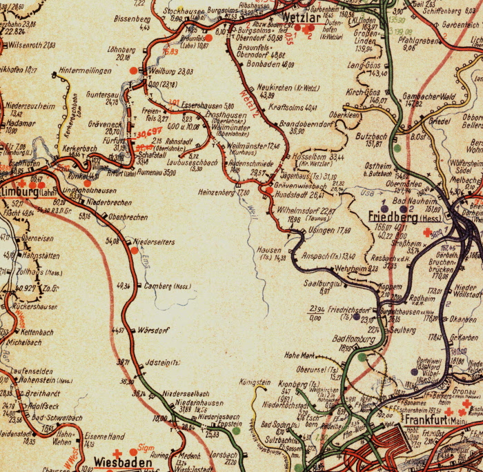 Die Kerkerbachbahn ist hier schon bis Hintermeilingen zurückgebaut. Dafür ist westlich der Strecke Frankfurt - Limburg die Reichsautobahnplanung in braun eingezeichnet!