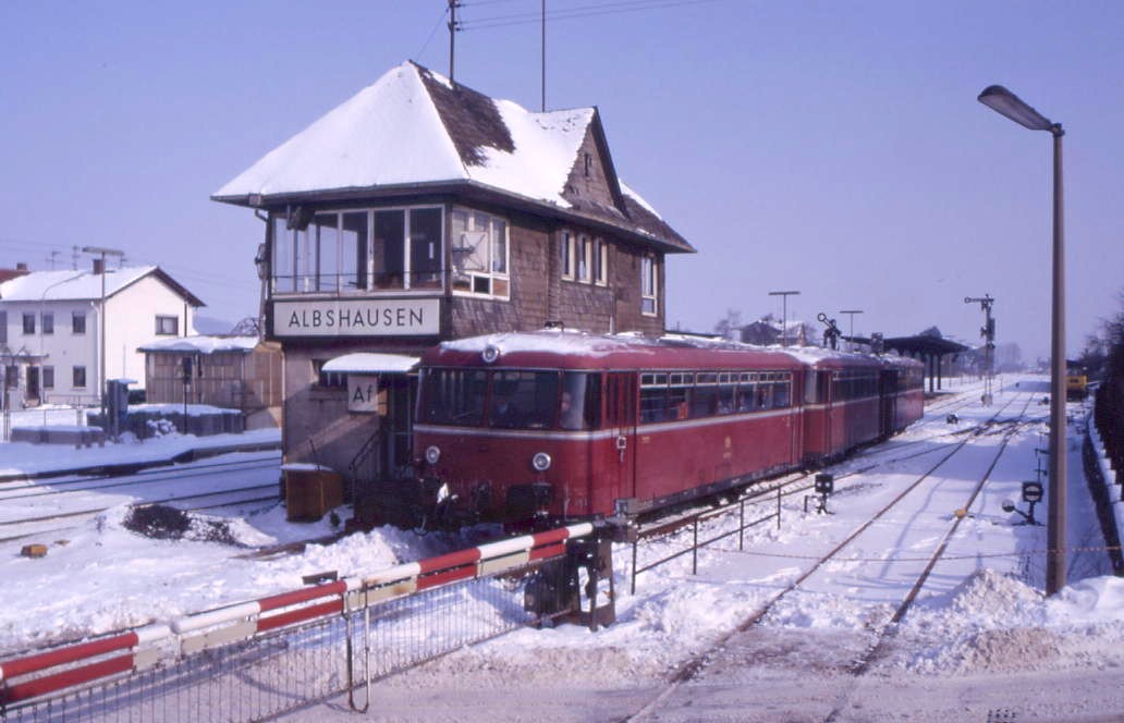 Der recht große Bahnhof mit einem Mittelperron und einem Seitenbahnsteig auf der Streckenseite nach Weilburg, war nie Endbahnhof der Züge aus Grävenwiesbach. Die große Industrievergangenheit von Albshausen ist noch heute erkennbar. Bis Anfang der achtziger Jahre führte eine Seilbahn zur letzten Temper-Erzgrube „Fortuna“ quer über das Lahntal zum Bahnhof Albshausen. |