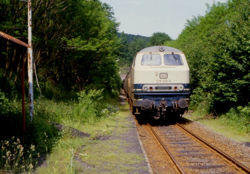 Vom Bahnhof Grävenwiesbach aus führte die Strecke nach Wetzlar einst zwischen Weichenwärterstellwerk rechts und Lokschuppen links zunächst noch leicht ansteigend durch Einschnitte und über teils hohe Dämme zur Haltestelle Jägerhaus, die zunächst nur eine Holzverladestelle war. |