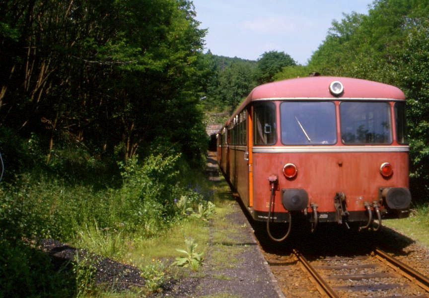 Unmittelbar hinter der Haltestelle verschwindet der Zug in den 1300 Meter langen schnurgeraden Hasselborner Tunnel, der unter dem Berg Gänserod durchführt. |