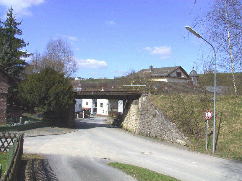 Am Fuße der Burg schmiegte sich die Bahn - links der Weil - an die Wälder des Tales und erreichte mit Essershausen den ersten richtigen Bahnhof. Essershausen - heute Ortsteil von Weilmünster - diente bis zuletzt im Personenverkehr als Ausweichstelle. Der kleine Bahnhof hatte selbst weniger Bedeutung als die unweit weilaufwärts gelegenen Verladeanlagen, wo Erz und Steine umgeschlagen wurden. Reste davon sind noch heute zu sehen, auch wenn sich die Natur einen guten Teil zurückgeholt hat. |