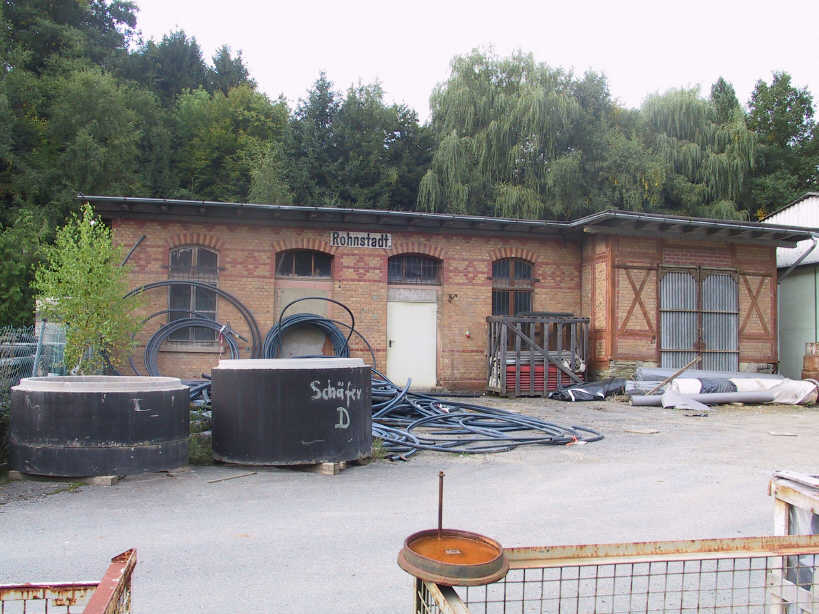 Unterwegs passiert der Radler das Gebäude des Haltepunkts Rohnstadt, das schon sehr lange nur noch als Lagerhalle genutzt wird. Es liegt auf dem Gelände des Bauunternehmens Schäfer. Die Halden ehemaliger Bergbaubetriebe weisen auf den Anschluß und das Sturzgerüst der Eisengrube Riesenberg hin. In der Nähe liegen spärliche Reste der im 18. Jahrhundert berühmten Grube Mehlbach, in der silberhaltiges Fahlerz gefördert wurde. |